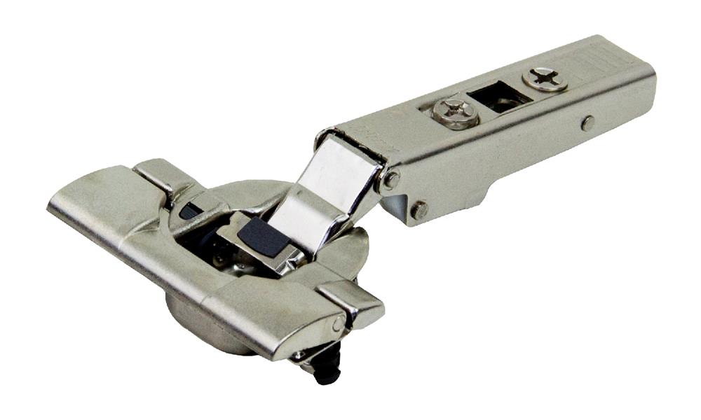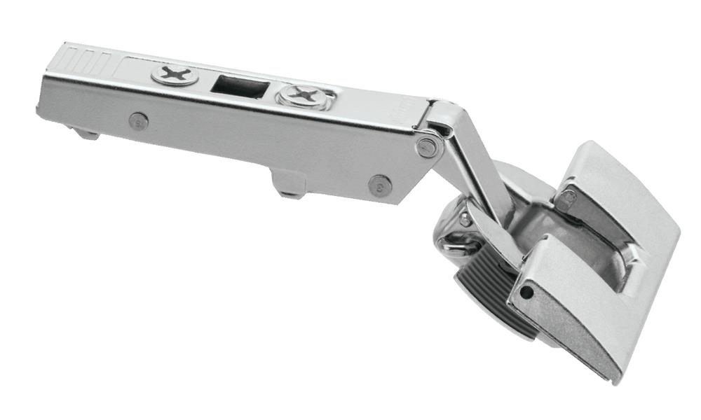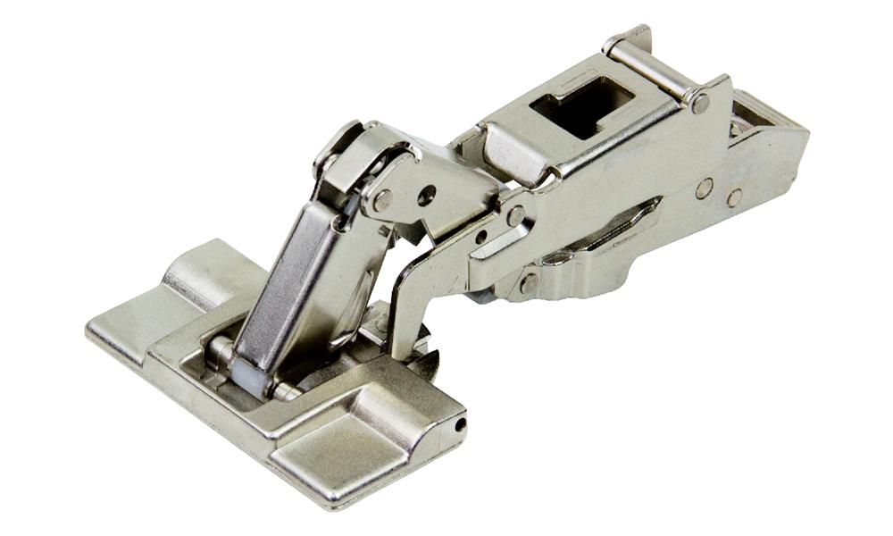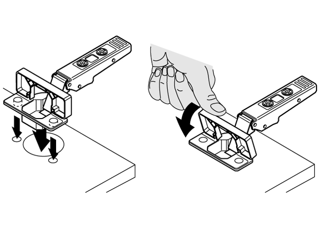 Inserta Hinges install without screws. The cover on the hinge cup acts as a lever, expanding an anchoring device which secures the hinge into pre-drilled recesses.