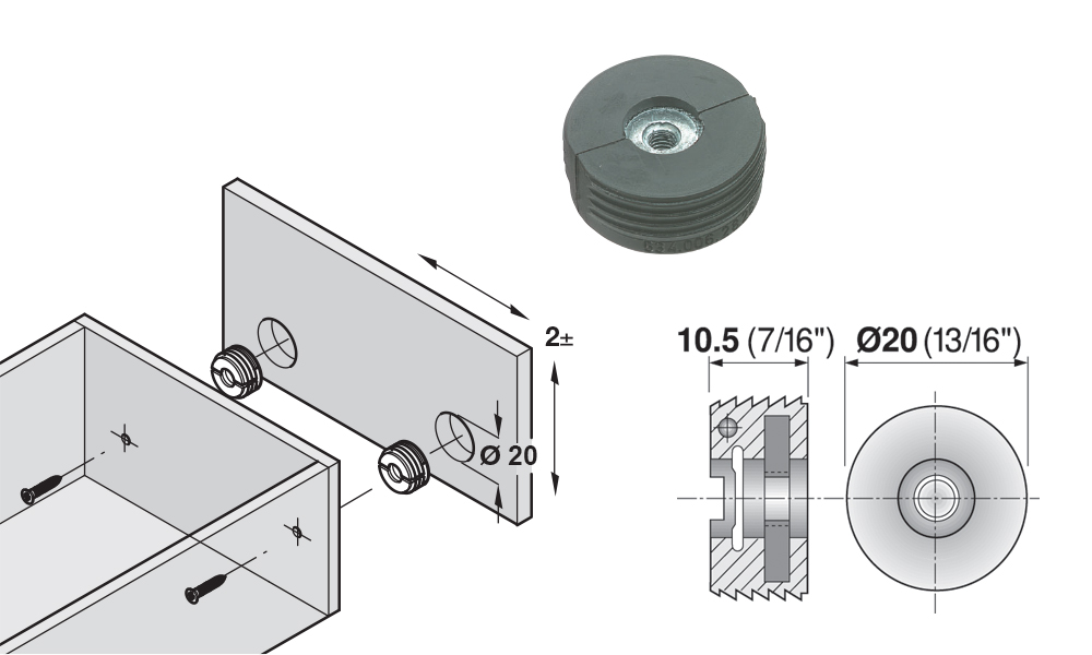 Fixes within the drawer front (requires a 20mm diameter / 10mm depth aperture) to allow for ±2mm of lateral & vertical movement