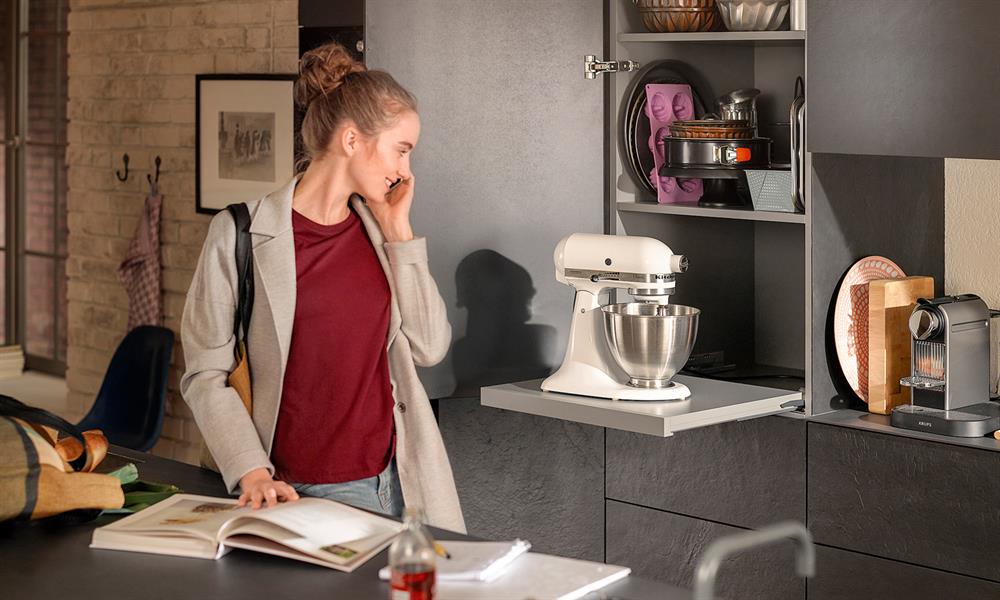 Create additional flexible worktop and shelf space: pull-out shelves are locked in position exactly where they are needed, be it in the kitchen, bathroom, living room or utility room. Mobilise kitchen gadgets and appliances, make them easy to use, and simple to store away again in seconds.