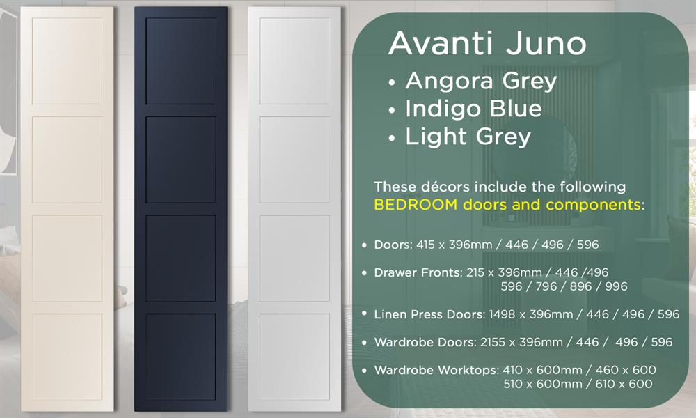The Angora Grey, Indigo Blue and Light Grey ranges include a selection of bedroom doors (wardrobe and linen press style doors), drawer fronts and wardrobe worktops.