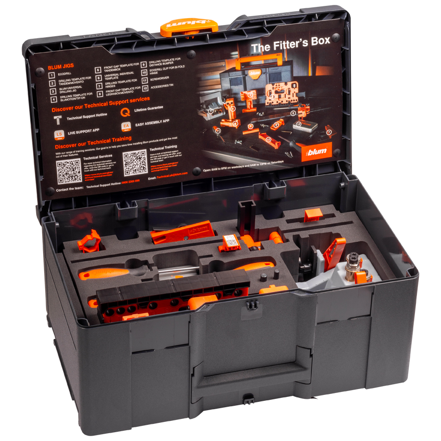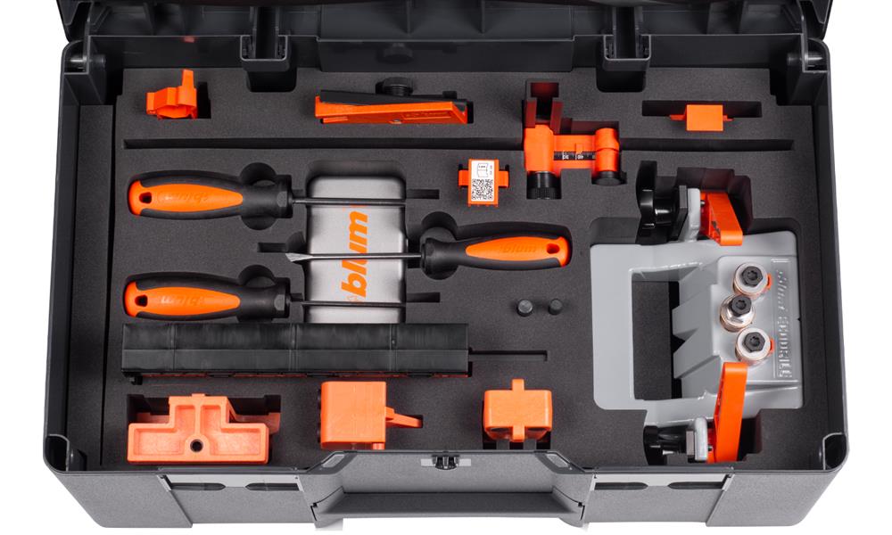 The Blum Fitters Box includes a wide range of tools, all to increase the efficiency of KBB projects. Whether working with box systems, lift-ups, hinges or runners, there's always a solution on hand.