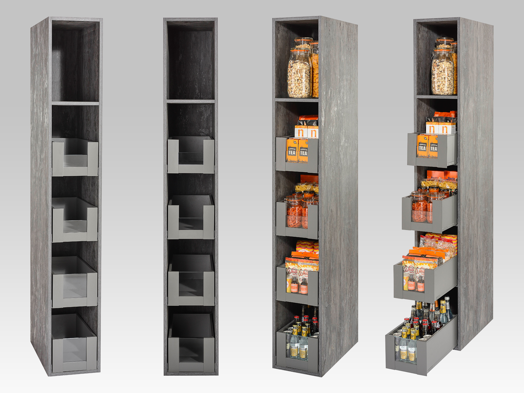 Such a capacity is even more remarkable given that the SPACE TOWER SLIM only requires a 300mm gap, making it the ideal addition to a tall larder unit that was once only suitable for shelves, with their limited capacity and product visibility. With two drawers featuring half-height glass fronts and two with full-height glass fronts, SPACE TOWER SLIM ensures contents are highly visible; the full extension runners allows full and easy access to the drawer contents.