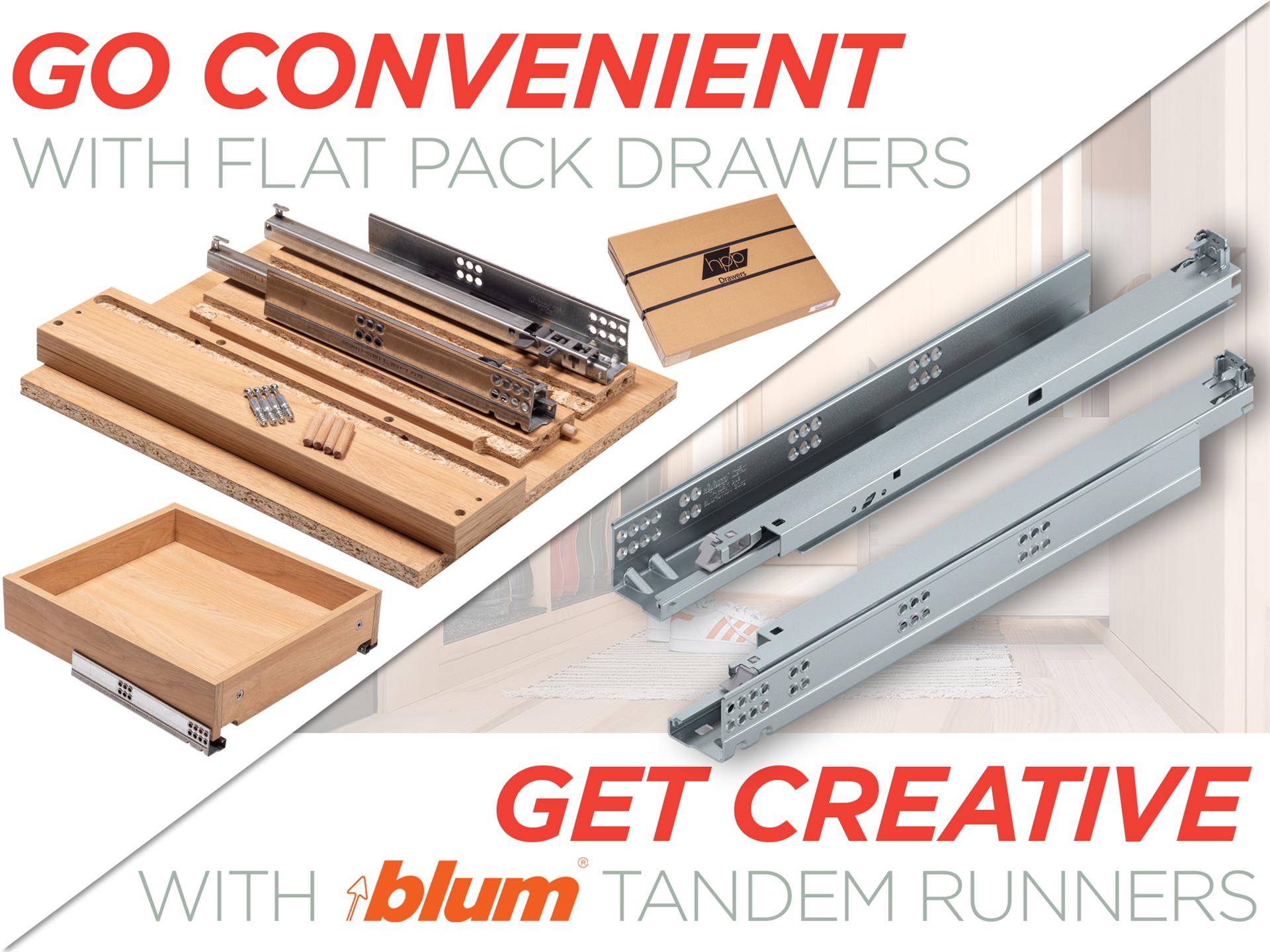 The flat packed drawer option obviously has some size and design limitations but they're quick and easy to have delivered & install. On the other hand, the Tandem runners give you as much design variation as you're ever likely to need.