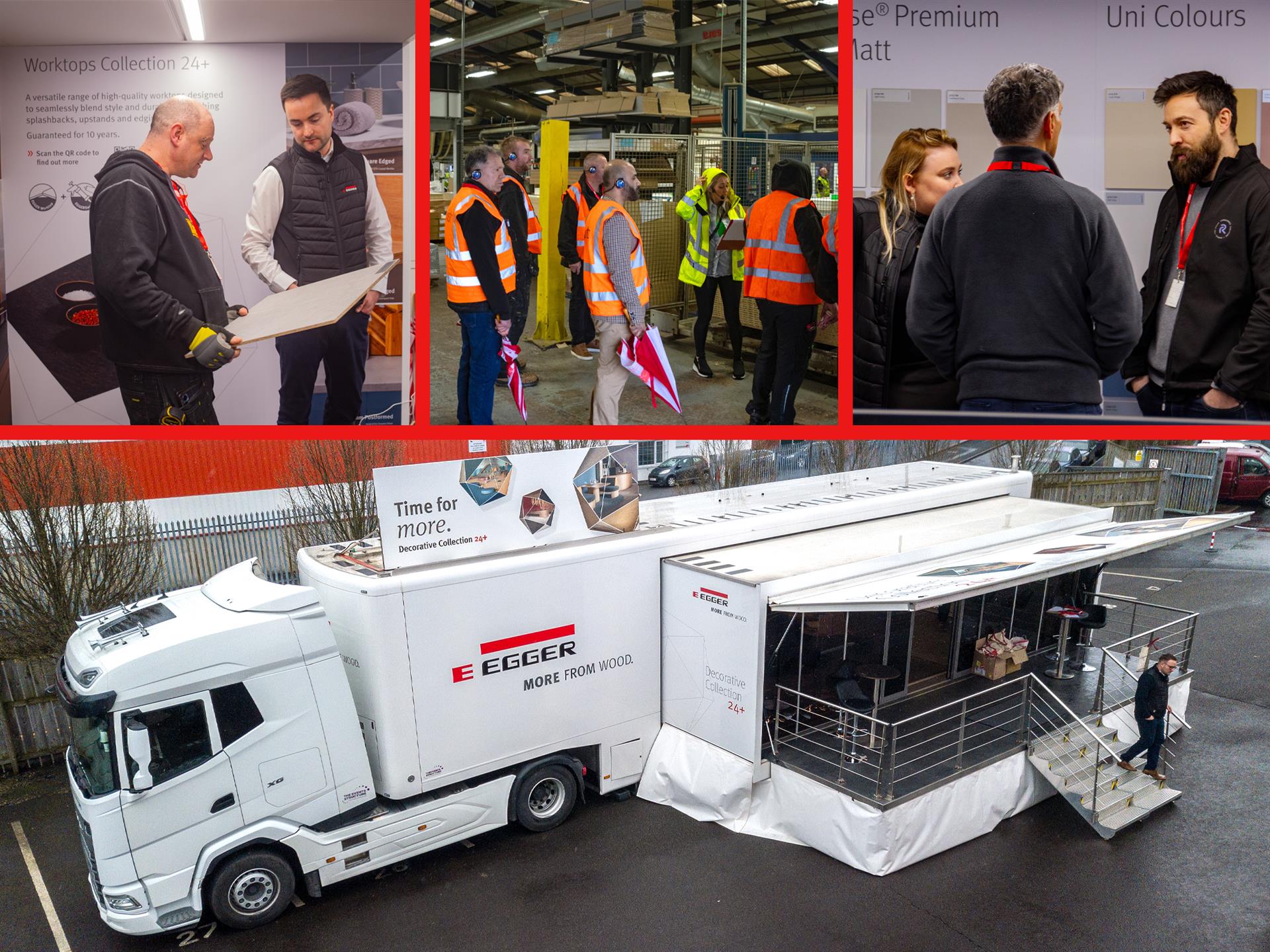 While the EGGER truck-cum-showroom was the centre of attention, visitors were also given guided tours of our site, which culminated in our newly developed Inspiration Centre behind the Trade Counter, where the full Decorative Collection 24+ is on permanent display.